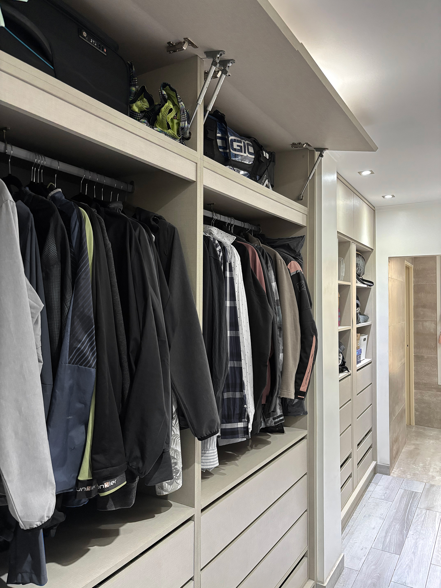 Para este proyecto, la clienta deseaba un vestidor de doble cámara que permitiera delimitar